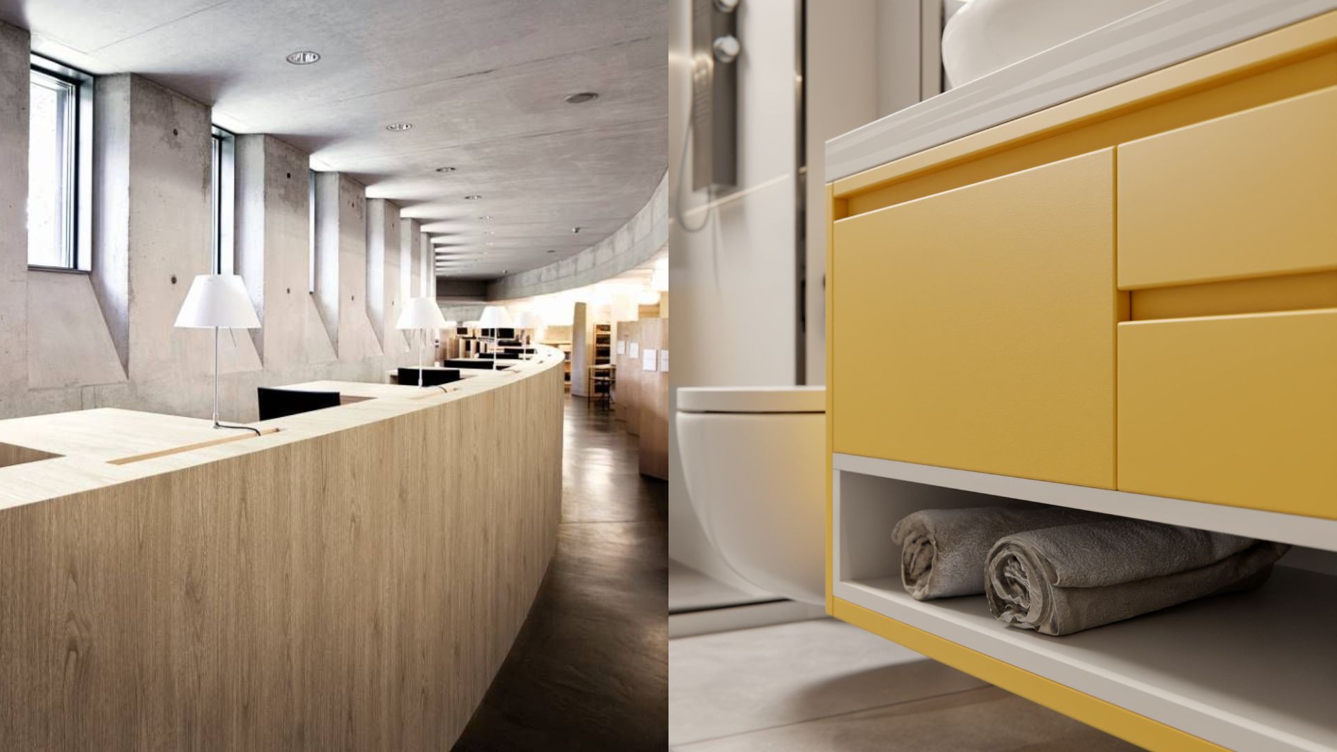 - Finitions variées : bois clair, marbre blanc, béton brut, cuir, métal brossé…